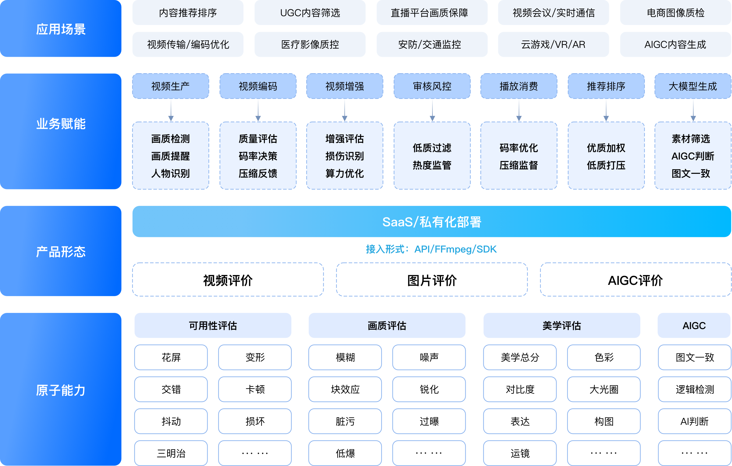 围绕四大核心场景提供 20+ 专业功能模块,覆盖可用性、画质、美学、AI 检测等全链路视频质量评估需求。