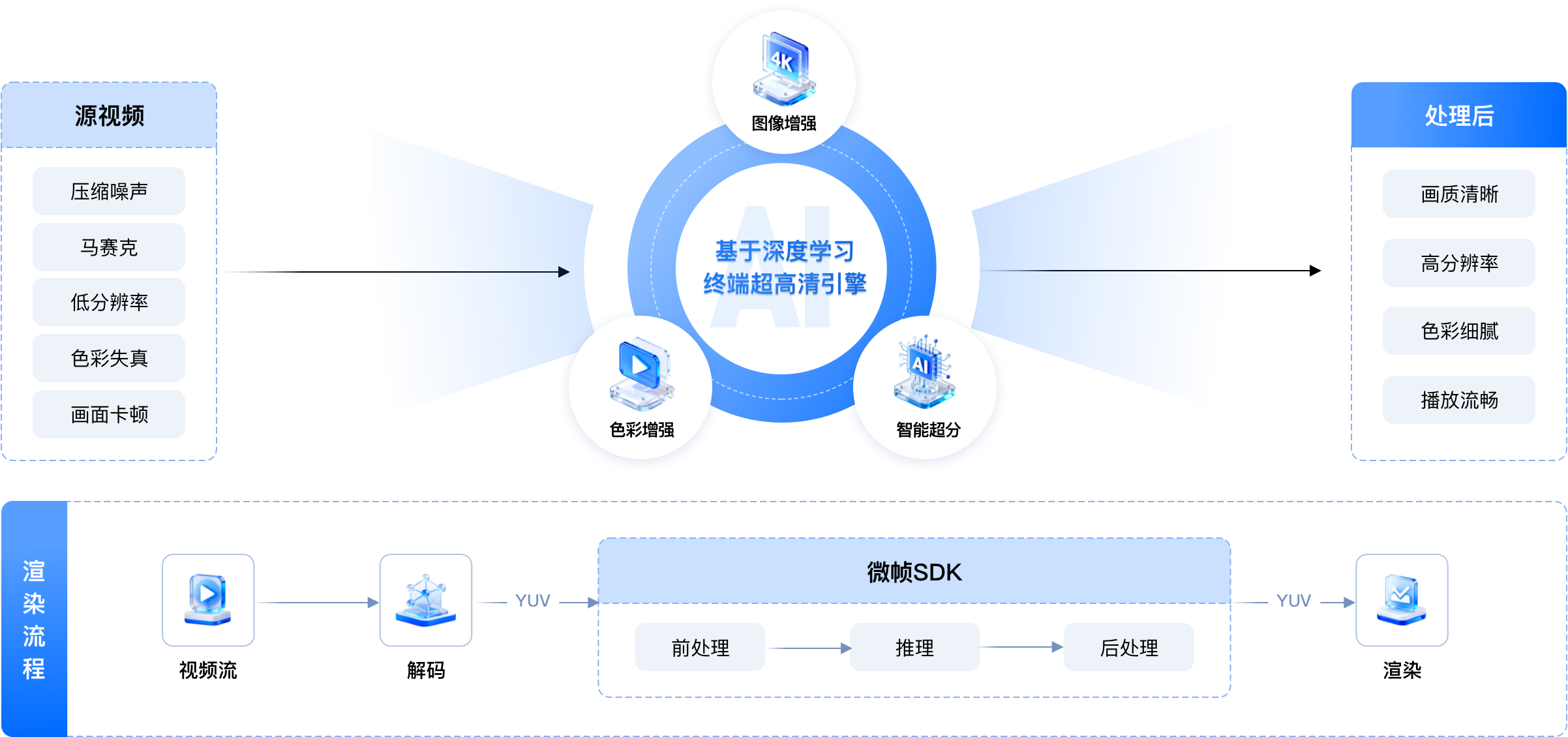 智能终端影像,是一款在视频播放终端利用算力对图像进行实时后处理,以提高视频观看效果的产品。支持在客户端进行实时智能超分、图像增强、色彩增强等处理能力。可广泛兼容并赋能于各类智能娱乐设备,涵盖家庭娱乐设备、新能源汽车智能大屏、智能手机、娱乐Pad,乃至电子手表等微小屏幕设备的多元化功能拓展。